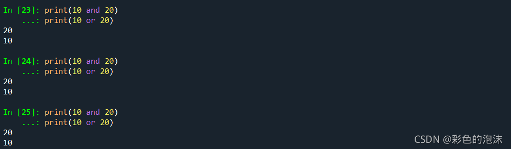 可以发现打印输出 10 and 20 总是打印后面的20;打印输出10 or 20 时,总是打印前面的10。