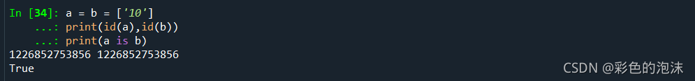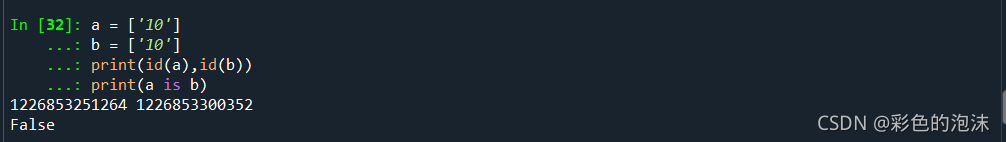 最后在这里我们可以注意到a与b的地址相等,与前两个又有着不同,在这里我想说的是:跟Java一样, 为提高内存利用效率, Python 解释器在运行程序时会建立一个共享对象池, 将常用的小整数(不大于256)都放在这个池子里.创建不大于256的整数对象时, 直接从池子里面取, 而不是分配新的内存空间创建新的对象.所以对于不大于256的整数, 相同值的整数对象其内存地址都一样。