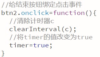 最后在开始按钮的点击事件外面也给结束的按钮绑定单击事件,那么在点击结束按钮时清除开始按钮里面的定时计时器,然后把timer的值重新赋值为true。如下图