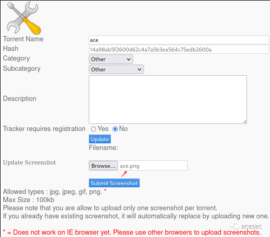 ? 修改ace.png.php改为ace.png,上传,然后再Submit Screenshot