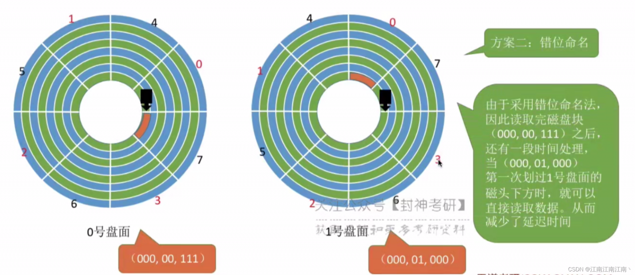 3.采用错位命名:不同盘面的相同扇区号对应的实际区域不同,这样可以使得磁头在读取完某个盘面后,可以有时间准备读取另一个盘面的数据