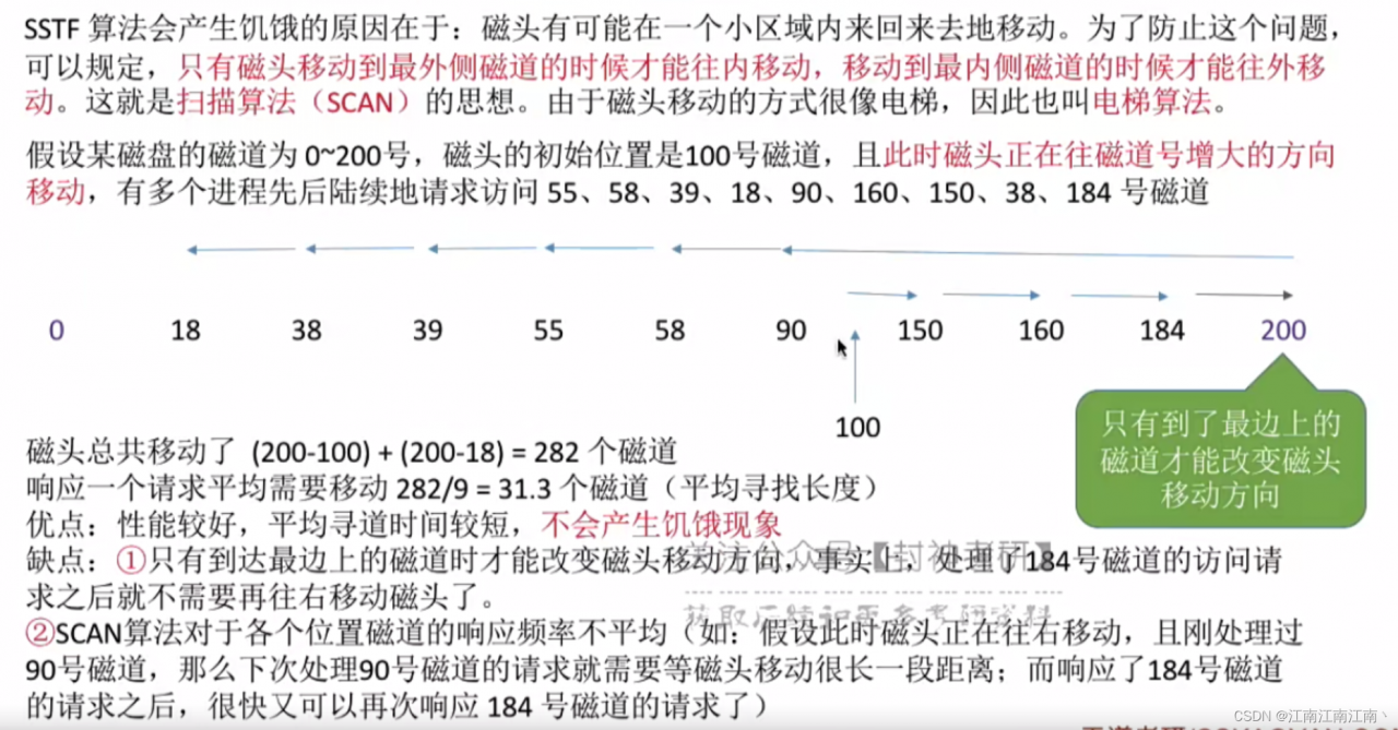 3.扫描(SCAN)算法:只有到最边上的磁道才能改变磁头的移动方向,导致边缘磁道响应频率高