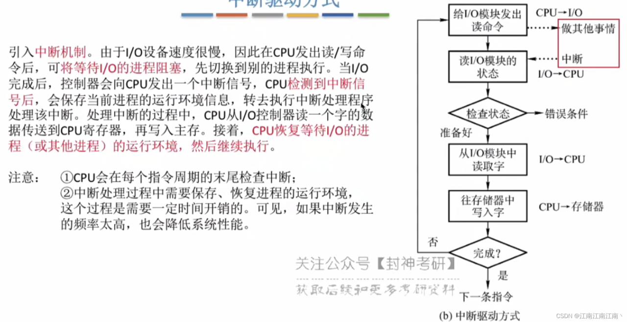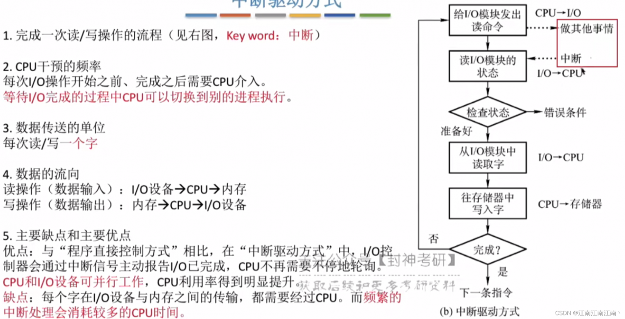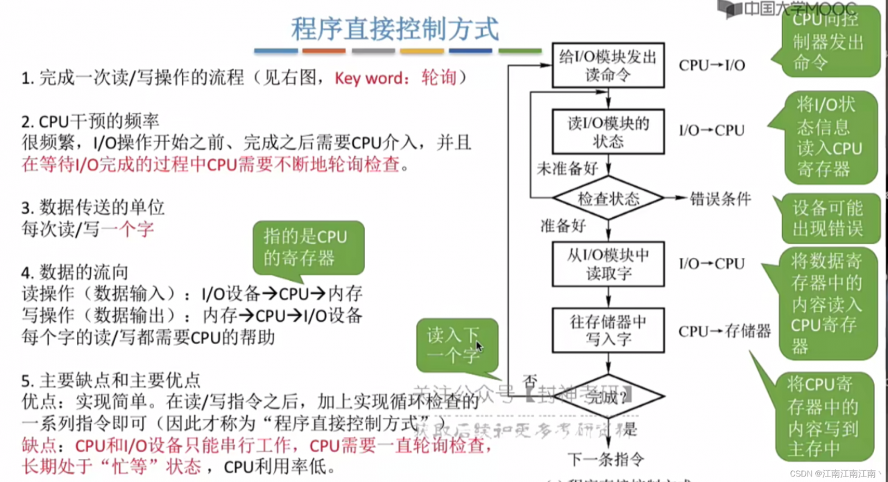 2. 特点:CPU需要过多的干预I/O操作,利用率低;以字为单位读/写;CPU和I/O设备串行工作