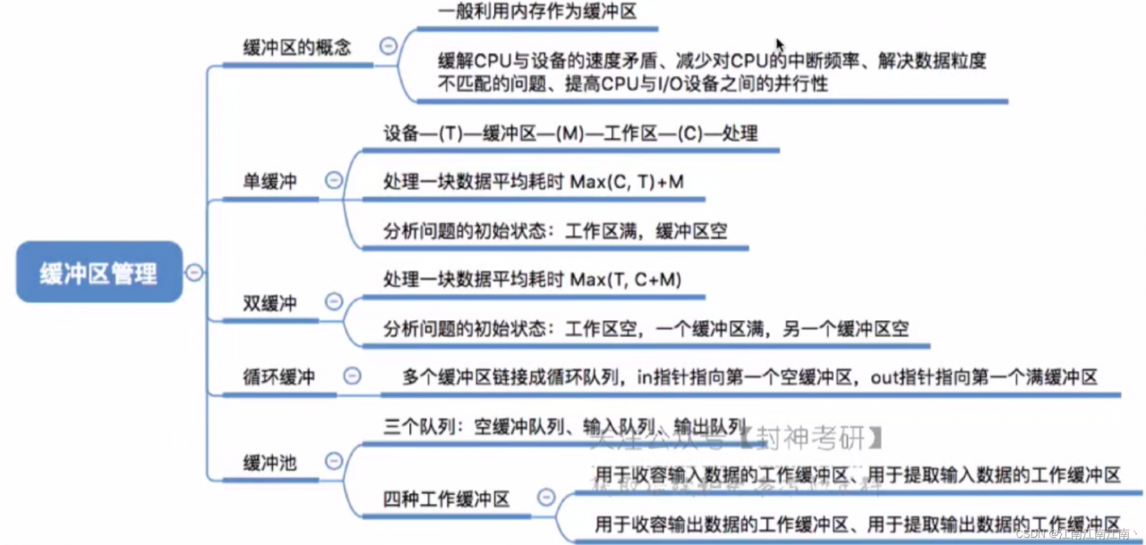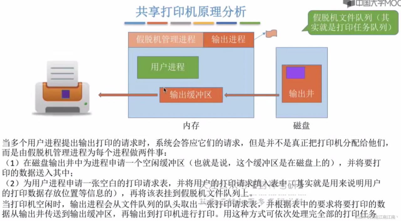 ②输出缓冲区:在输出进程的控制下,从磁盘的输出井中取出数据,再传送到输出设备中(输出井→输出缓冲区→输出设备)