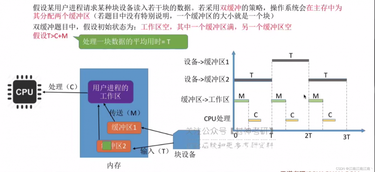 ①I/O设备输入缓冲区的时间T>CPU对数据处理时间C+数据从缓冲区传送到工作区时间M: