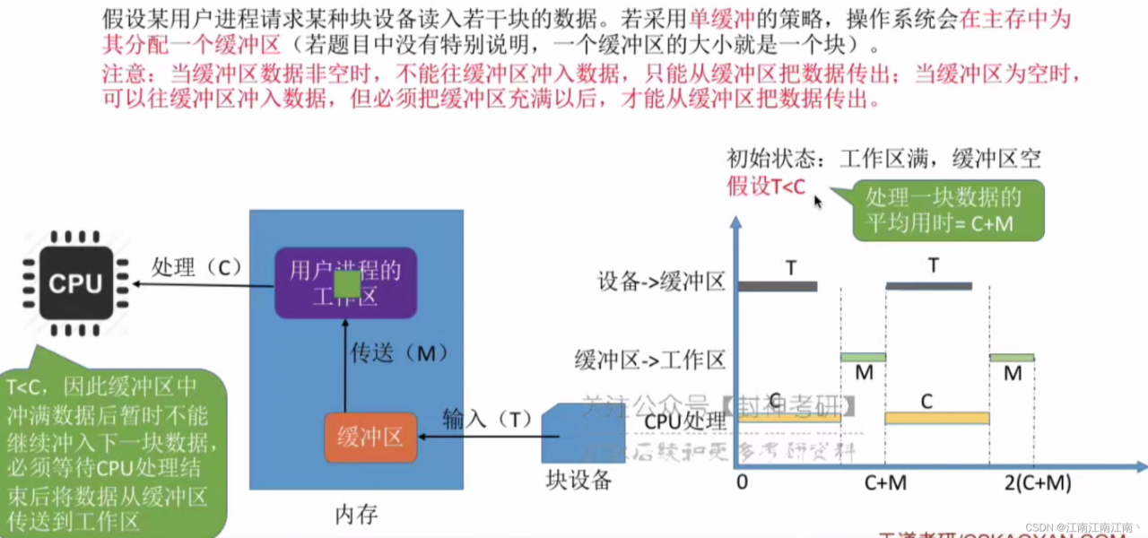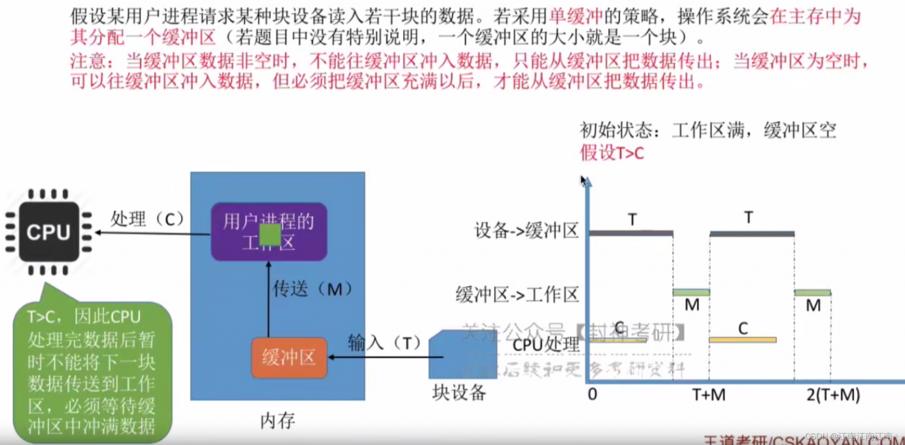 ②I/O设备输入缓冲区的时间T < CPU对数据处理时间C:I/O设备完成对缓冲区的输入后,需要等待CPU对数据的处理完成后,才能开始将数据放入工作区中