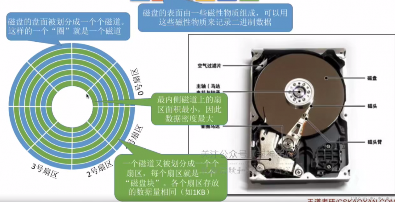3.磁道被分为若干扇区,每个扇区的存放的数据量相同;由于每个扇区的数据量相同,但最内侧的扇区面积最小,因此,最内侧磁道上的扇区数据密度最大
