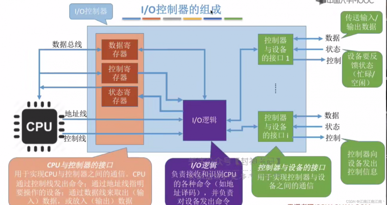 ①CPU与控制器的接口(即CPU和I/O控制器连接的部分):实现CPU和控制器的通信