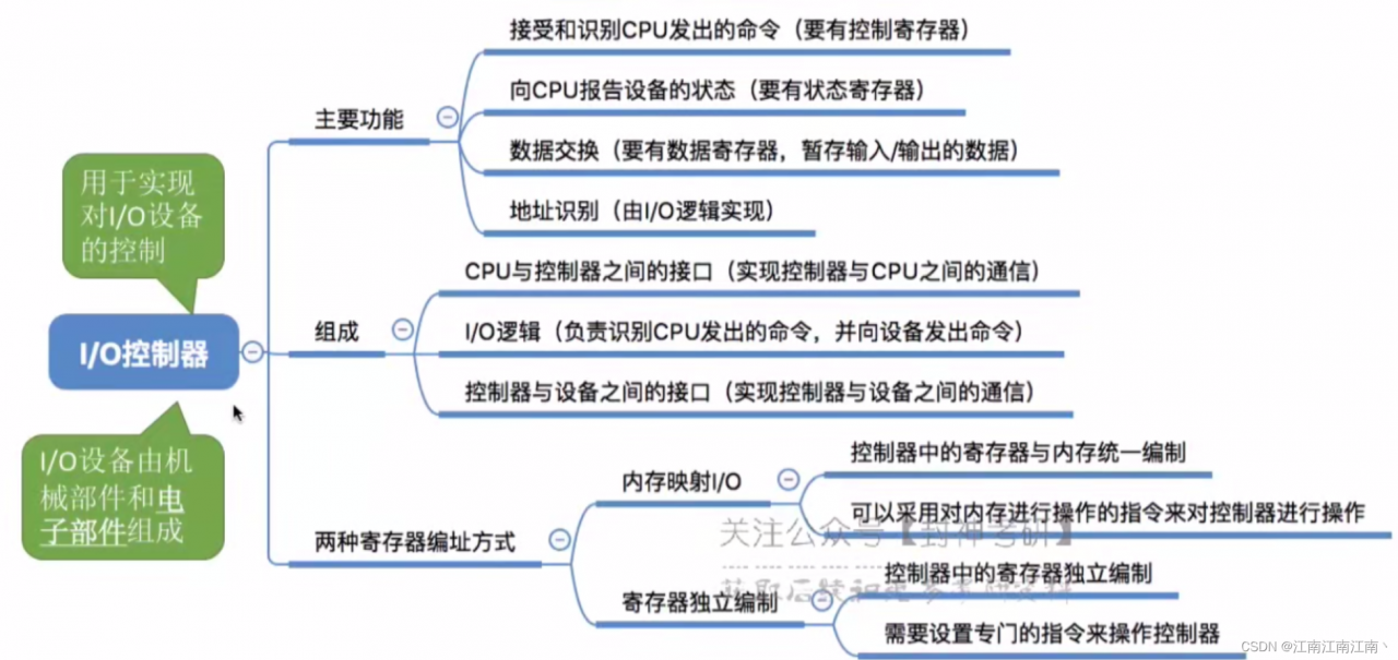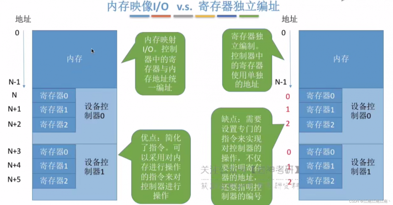 (2)在有多个I/O设备的情况下,数据、状态、控制寄存器可能有多个,需要对这些寄存器进行编址,方便识别是对哪个寄存器进行操作。有两种编址方式:第一种,这些寄存器占用内存地址的一部分,称位内存映像I/O;第二种,采用I/O专用地址,即寄存器独立编址