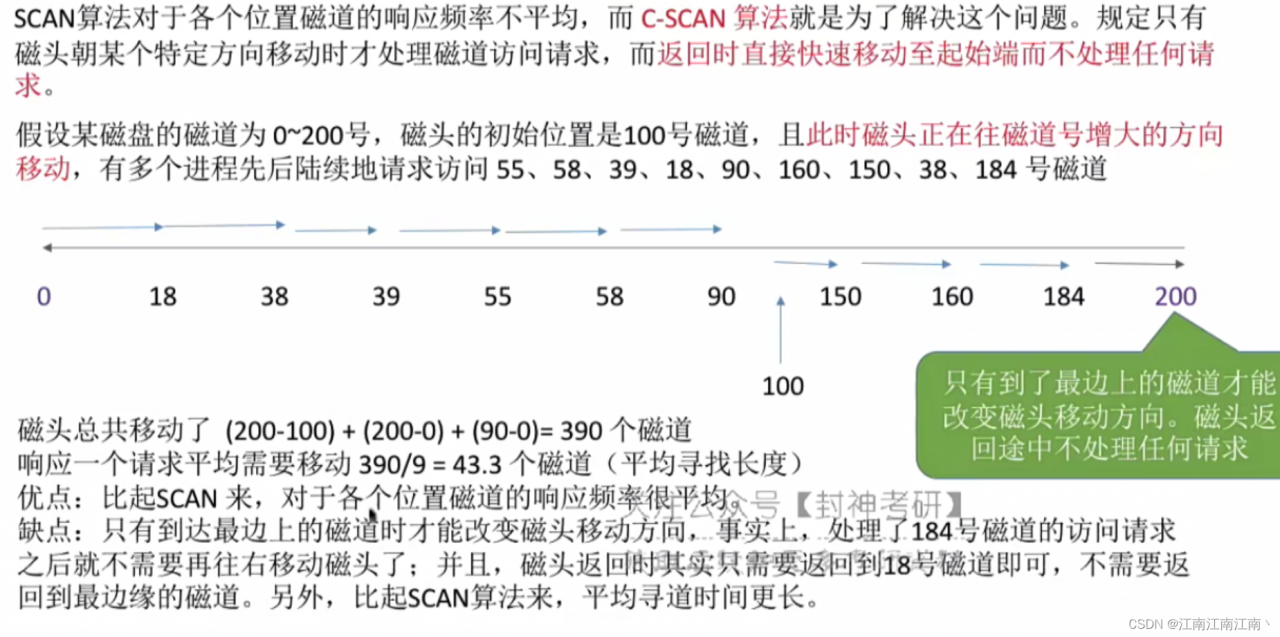 5.循环扫描(C-SCAN)算法:解决SCAN算法中各个位置磁道响应频率不均匀的问题