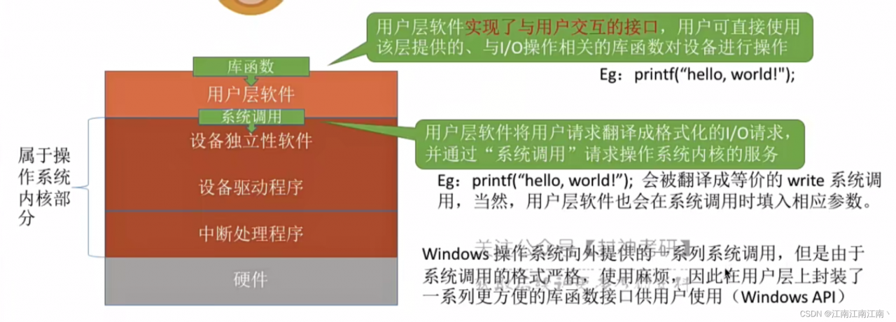 ②向下:将用户的请求翻译为格式化的I/O请求,并通过系统调用请求操作系统内核服务