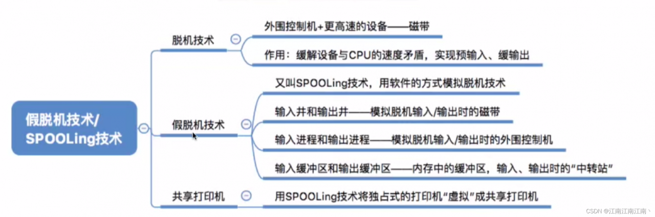 1.脱机:脱离主机的控制进行输入/输出;假脱机技术是用软件的方式模拟脱机技术,需要多道程序设计的支持(并发)