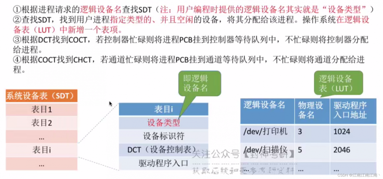 ③只有第一次通过逻辑设备名申请使用设备时候才需要找系统控制表,之后用户再次以相同的逻辑设备名,操作系统首先在逻辑设备表中查找该逻辑设备所对应的物理设备