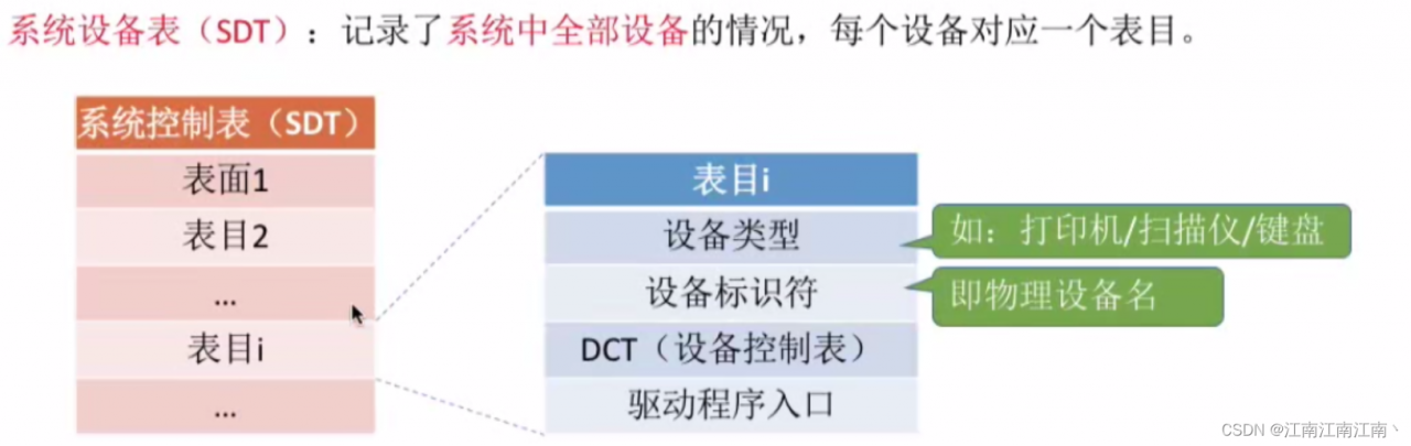 ④系统设备表:记录系统中所有设备的情况,当用户通过设备名请求某个设备时,操作系统可以根据设备名在系统设备表中找到相对应的设备