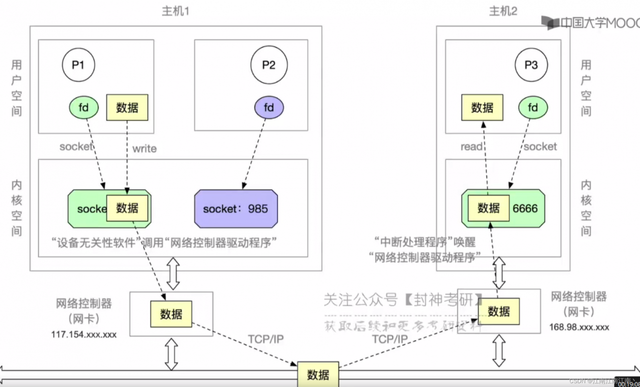 ⑥P1网络控制器将数据发送到P3的网络控制器中,P3的网络控制器收到数据后,向主机2发出中断信号,中断处理程序调用网络控制器驱动程序,网络控制器驱动程序将数据输入到socket的内核缓冲区中