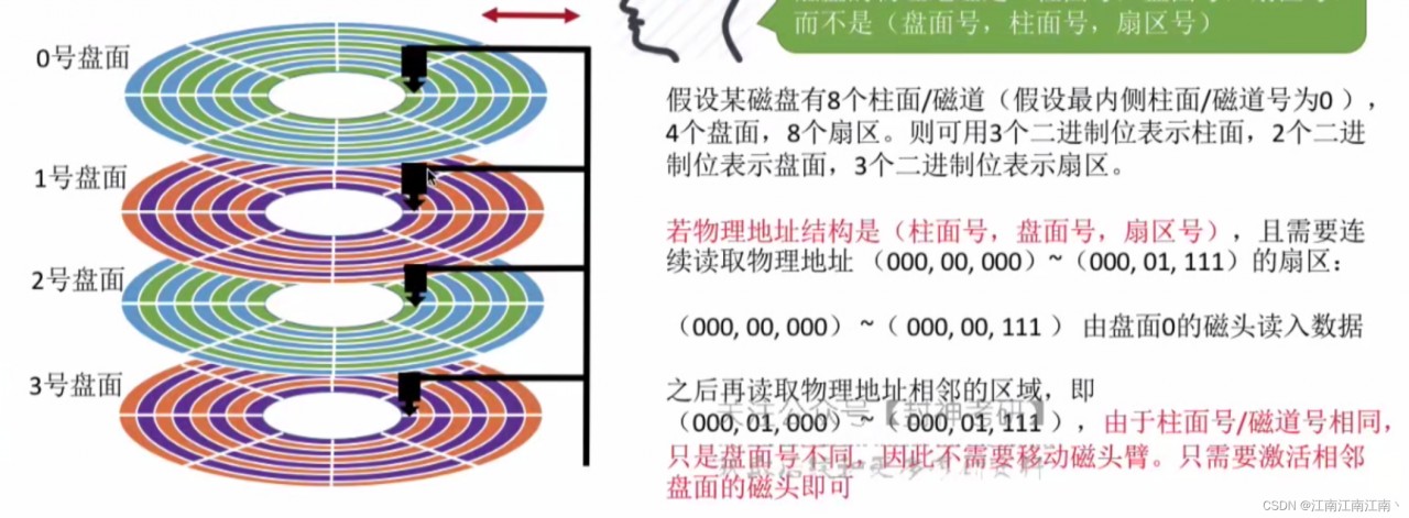 2.采用(柱面号,盘面号,扇区号)的编址方式:在同一个柱面号和盘面号的情况下,仅需激活不同的磁头就可以读取连续地址空间,而如果采用(盘面号,柱面号,扇区号)的方式,读取连续的地址空间,就可能需要激动不同的磁头臂来回移动磁头