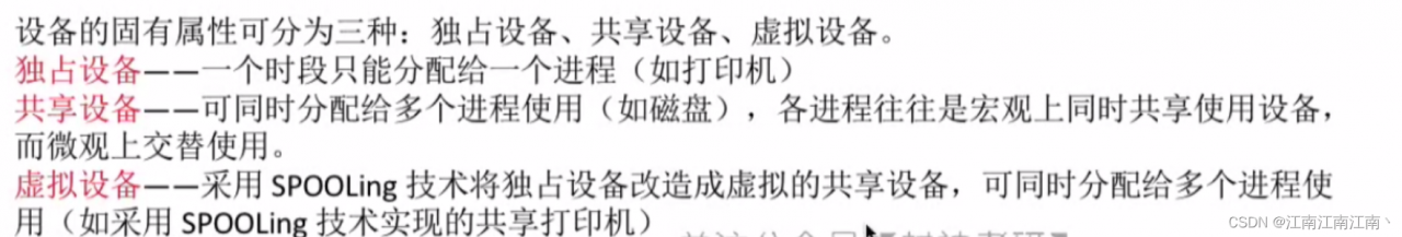 1.设备的固有属性:独占设备、共享设备和虚拟设备