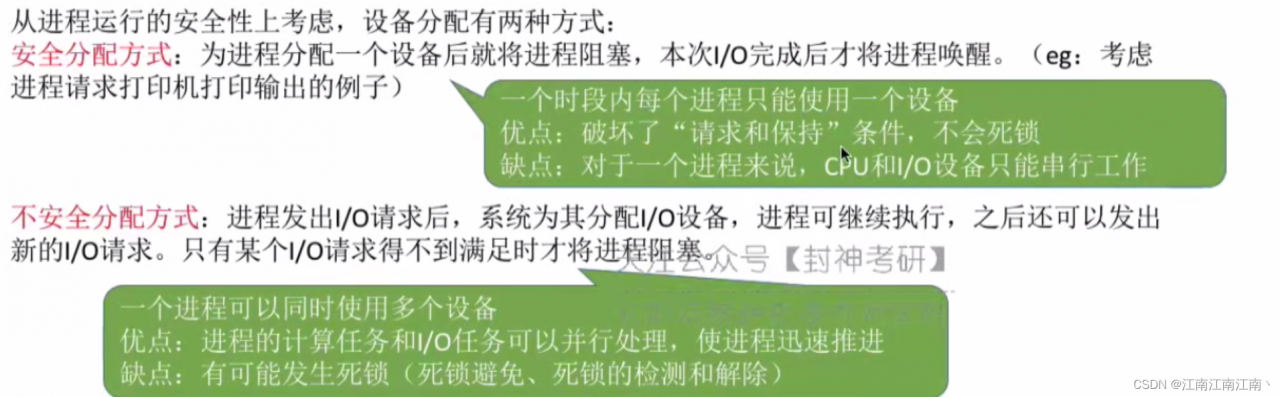 2.根据设备分配安全性区分的方式:安全分配方式和不安全分配方式(是否导致死锁)