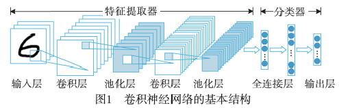 在卷积神经网络中,输入图像通过多个卷积层和池化层进行特征提取,逐步由低层特征变为高层特征;高层特征再经过全连接层和输出层进行特征分类,产生一维向量,表示当前输入图像的类别。因此,根据每层的功能,卷积神经网络可以划分为两个部分: 由输入层、卷积层和池化层构成特征提取器,以及由全连接层和输出层构成分类器,结构如下图1所示。