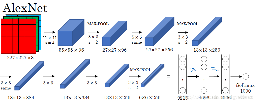 - 网络的训练开销非常大,硬件性能支持的不足使得网络结构的研究非常困难。 以上三大制约卷积神经网络发展的重要因素在近期的研究中取得了突破性的进展是卷积神经网络成为一个新的研究热点的重要原因。并且,近期针对卷积神经网络的深度和结构优化方面的研究进一步提升了网络的数据拟合能力。针对 Le Net-5 的缺陷,Krizhevsky 等提出了Alex Net。Alex Net 有5层卷积网络,如下图2所示。网络有约65万个神经元以及6 000万个可训练参数,从网络规模上大大超越了Le Net-5。另外,Alex Net选择了大型图像分类数据库 Image Net作为训练数据集。Image Net 提供了1 000个类别共 120 万张图片进行训练,图片的数量和类别都大幅度超越了以往的数据集。在去过拟合方面,Alex Net 引了dropout,一定程度上减轻了网络过拟合问题。在硬件支持方面,Alex Net 使用了GPU进行训练,相比传统的CPU 运算,GPU 使网络的训练速度提高了十倍以上。Alex Net在 Image Net 的 2012 图像分类竞赛中夺得冠军,并且相比于第二名的方法在准确度上 取得了高出11% 的巨大优势。Alex Net 的成功使得卷积神经网络的研究再次引起了学术界的关注。