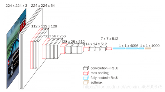 Simonyan 等在Alex Net 的基础上,针对卷积神经网络的深度进行了研究提出了VGG 网络。VGG 由3×3的卷积核构建而成,通过对比不同深度的网络在图像应用中的性能。Simonyan等证明了网络深度的提升有助于提高图像分类的准确度。然而,这种深度的增加并非没有限制,在恰当的网络深度基础上继续增加网络的层数,会带来训练差增大的网络退化问题。因此,VGG 的最佳网络深度被设定在了16~19 层,结构如下图3所示。