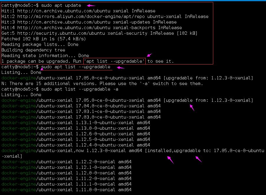本机采用ubuntu16.04系统,已使用sudo apt update && sudo apt upgrade -y将系统更新到最新的ubuntu 16.04.03。再使用阿里源,单独安装Docker v1.12.3版本的软件,执行如下操作,对比两个命令的差别。
