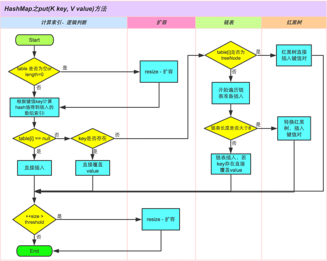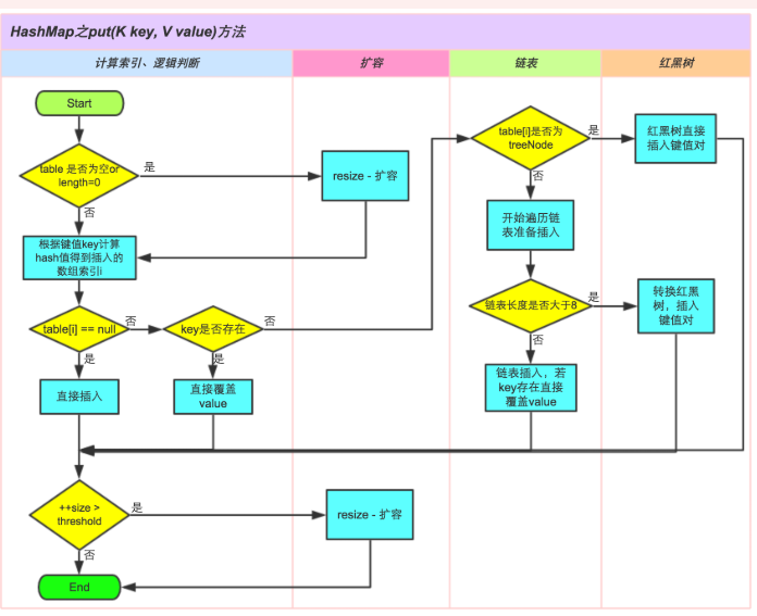 最后,在知道了底层的数据结构优化过程后,从重要核心方法的执行流程入手,先去了解到它的执行流程 (推荐看流程图),再去看源码: