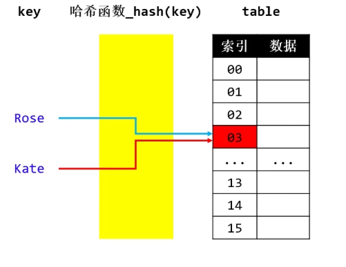 例如上图,key=“Rose” 经过哈希函数换算得到索引是03,然后将key对应的value放到索引为03的数组元素位置上;