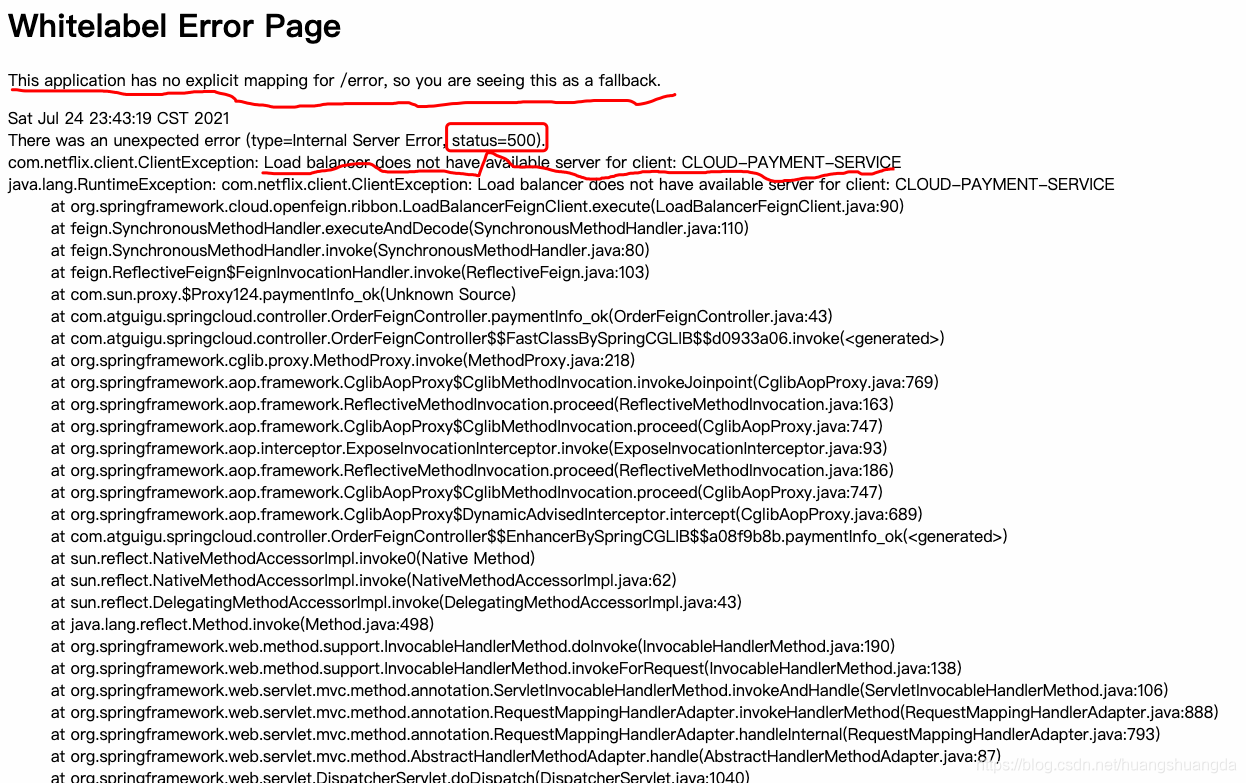 错误信息: Load balancer does not have available server for client: CLOUD-PAYMENT-SERVICE。从错误信息来开就是找不了服务明称为CLOUD-PAYMENT-SERVICE的服务。打开注册中的界面这个服务有正常的注册上去的。