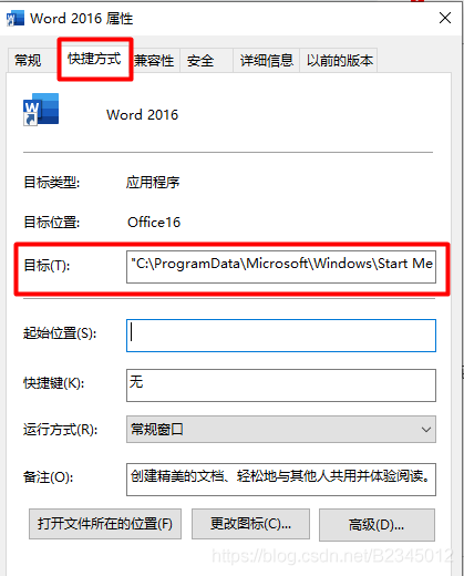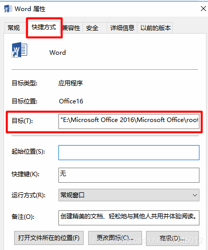将目标中的路径更改为程序安装路径下快捷方式需要链接的程序,例如我的位置是E:\Microsoft Office 2016\Microsoft Office\root\Office16\WINWORD.EXE
