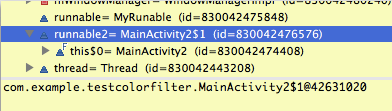 可以看到,runnable1是没有什么特别的。但runnable2多出了一个MainActivity的引用,若是这个引用再传入到一个异步线程,此线程在和Activity生命周期不一致的时候,也就造成了Activity的泄露。