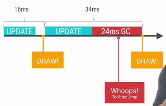 为了达到这个目的,GC需要停止程序的其他活动,阻塞进程。这里我们要注意的是:**不要频繁的引发GC,执行GC操作的时候,任何线程的任何操作都会需要暂停,等待GC操作完成之后,其他操作才能够继续运行, 故而如果程序频繁GC, 自然会导致界面卡顿. **通常来说,单个的GC并不会占用太多时间,但是大量不停的GC操作则会显著占用帧间隔时间(16ms。可参见《【Android 性能优化】—— UI篇》)。如果在帧间隔时间里面做了过多的GC操作,那么自然其他类似计算,渲染等操作的可用时间就变得少了。