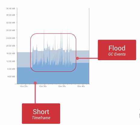 - 瞬间产生大量的对象会严重占用Young Generation的内存区域,当达到阀值,剩余空间不够的时候,也会触发GC。即使每次分配的对象占用了很少的内存,但是他们叠加在一起会增加 Heap的压力,从而触发更多其他类型的GC。这个操作有可能会影响到帧率,并使得用户感知到性能问题。