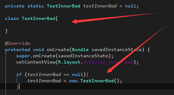 这样就在Activity内部创建了一个非静态内部类的单例,每次启动Activity时都会使用该单例的数据,这样虽然避免了资源的重复创建,不过这种写法却会造成内存泄漏,因为非静态内部类默认会持有外部类的引用,而该非静态内部类又创建了一个静态的实例,该实例的生命周期和应用的一样长,这就导致了该静态实例一直会持有该Activity的引用,导致Activity的内存资源不能正常回收。正确的做法为: