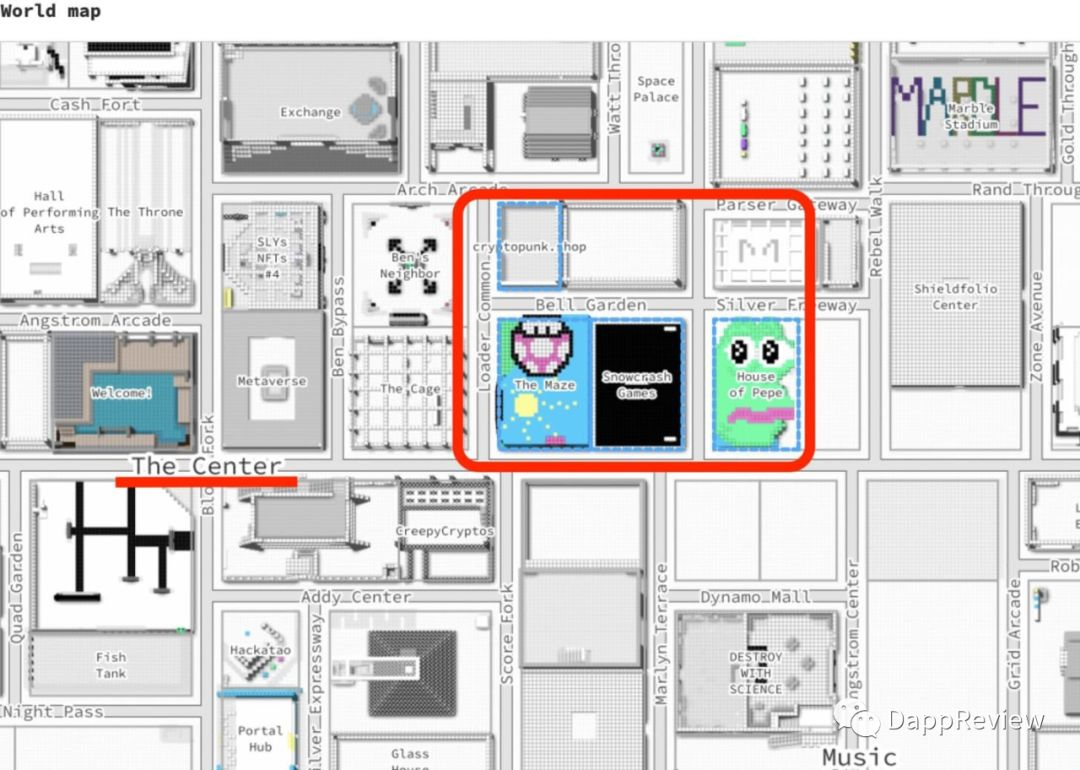 我还有一个发现,既然所有新玩家都是从世界中心(The Center,下图中用红色下划线标出)进入游戏,那么“中心”周边的地皮一定会寸土寸金。