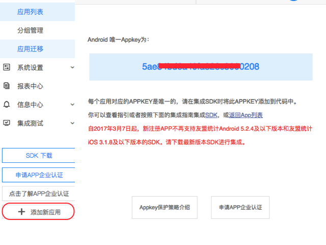 集成【友盟+】SDK之前,您首先需要到 【友盟+】官网注册并且添加新应用,获得AppKey。