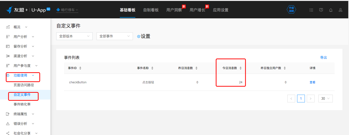 public void onClick(View v) { Toast.makeText(MainActivity.this, "点击了", Toast.LENGTH_SHORT).show(); MobclickAgent.onEvent(MainActivity.this, "checkButton");//参数二为当前统计的事件ID } }); 运行程序后,在友盟后台可看到以下结果