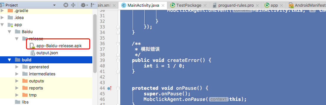 public class MyApplication extends Application { @Override public void onCreate() { super.onCreate(); /** * 初始化common库 * 参数1:上下文,必须的参数,不能为空 * 参数2:友盟 app key,非必须参数,如果Manifest文件中已配置app key,该参数可以传空,则使用Manifest中配置的app key,否则该参数必须传入 * 参数3:友盟 channel,非必须参数,如果Manifest文件中已配置channel,该参数可以传空,则使用Manifest中配置的channel,否则该参数必须传入,channel命名请详见channel渠道命名规范 * 参数4:设备类型,必须参数,传参数为UMConfigure.DEVICE_TYPE_PHONE则表示手机;传参数为UMConfigure.DEVICE_TYPE_BOX则表示盒子;默认为手机 * 参数5:Push推送业务的secret,需要集成Push功能时必须传入Push的secret,否则传空 */ //如果AndroidManifest.xml清单配置中没有设置appkey和channel,则可以在这里设置 // UMConfigure.init(this, "58edcfeb310c93091c000be2", "Umeng", UMConfigure.DEVICE_TYPE_PHONE, "1fe6a20054bcef865eeb0991ee84525b"); UMConfigure.init(this, UMConfigure.DEVICE_TYPE_PHONE,""); } } 2. 实现多渠道打包代码