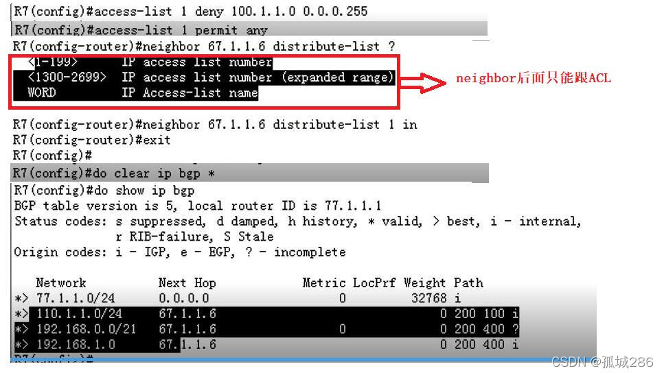 nei 4.4.4.4 distribute-list 1 in//neighbor实现功能:只允许从4.4.4.4收满足ACL的permit流量路由,后面使用