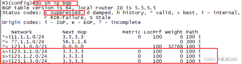 - 抑制路由:被聚合的明细路由 。以S>开头。