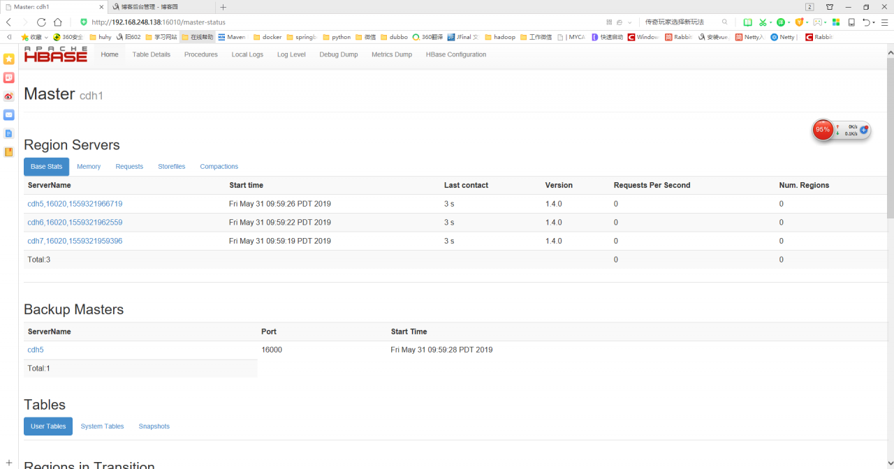 | 192.168.248.142 | cdh5 | hadoop2.8 jdk1.8 zookeeper3.4.13 hbase1.4.0 | QuorumPeerMain JournalNode DataNode NodeManager HMaster HRegionServer | http://cdh5:16010/master-status |