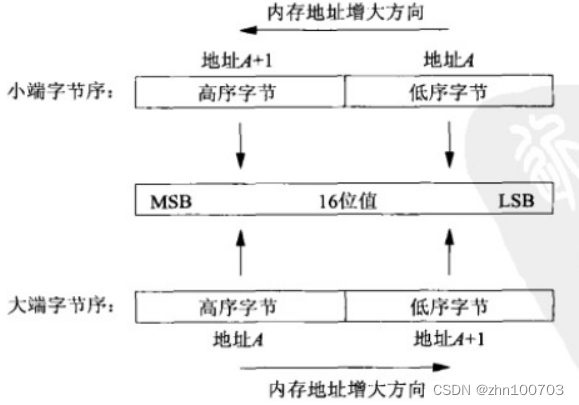 对于一个由2个字节组成的16位整数,在内存中存储这两个字节有两种方法:一种是将低序字节存储在起始地址,这称为小端(little-endian)字节序;另一种方法是将高序字节存储在起始地址,这称为大端(big-endian)字节序。