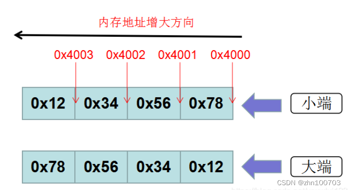 假如现有一32位int型数0x12345678,那么其MSB(Most Significant Byte,最高有效字节)为0x12,其LSB (Least Significant Byte,最低有效字节)为0x78,在CPU内存中有两种存放方式:(假设从地址0x4000开始存放)