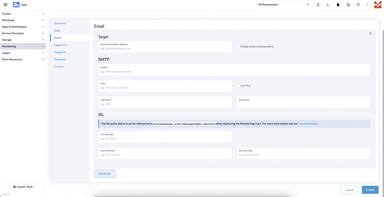Receivers 配置告警媒介,例如填写 SMTP 地址和配置的账号/密码,默认接收的邮箱:
