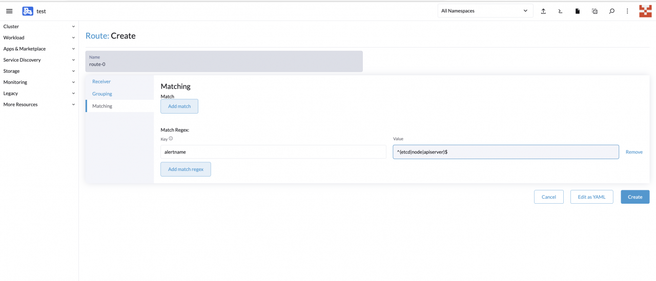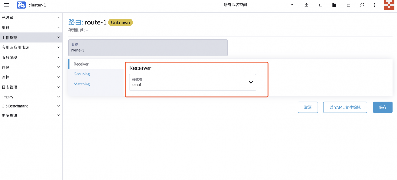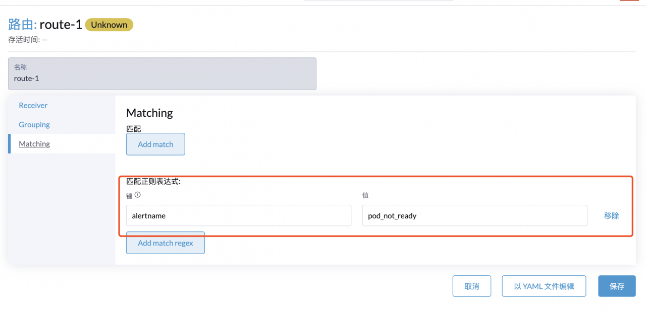 此时全部的告警规则都会发送给配置的告警媒介,若要细分告警规则创建新的 Routes 通过 Label 与 Prometheus Rules 内对应的 Alter name 对接。