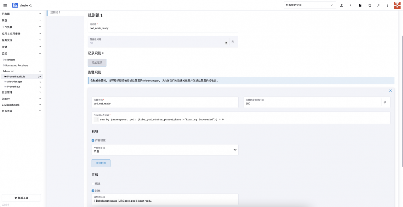 默认启用监控会会自动添加一些 ServiceMonitor 监控规则和 Prometheus Rules 告警规则,主要是针对平台组件监控和集群内节点状态监控和告警。