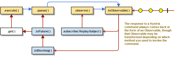 Observable<K> ocValue = command.toObservable(); // cold observable(注:只有在返回的ocValue上调用subscribe时,才会发出请求)在内部实现中,execute()是同步调用,内部会调用queue().get()方法。queue()内部会调用toObservable().toBlocking().toFuture()。也就是说,HystrixCommand内部均通过一个Observable的实现来执行请求,即使这些命令本来是用来执行同步返回回应这样的简单逻辑。