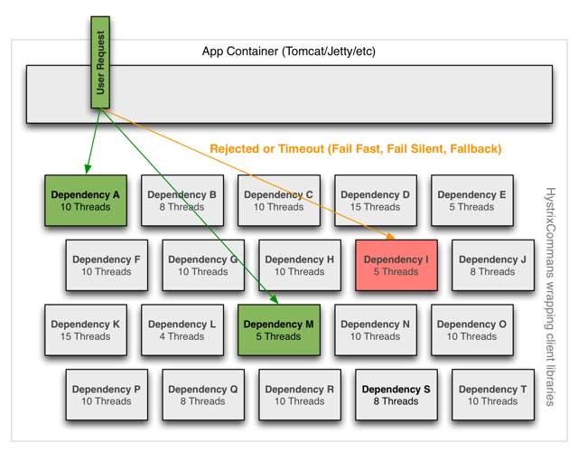 Hystrix 通过使用『舱壁模式』(注:将船的底部划分成一个个的舱室,这样一个舱室进水不会导致整艘船沉没。将系统所有依赖服务隔离起来,一个依赖延迟升高或者失败,不会导致整个系统失败)来隔离依赖服务,并限制访问这些依赖服务的并发度。