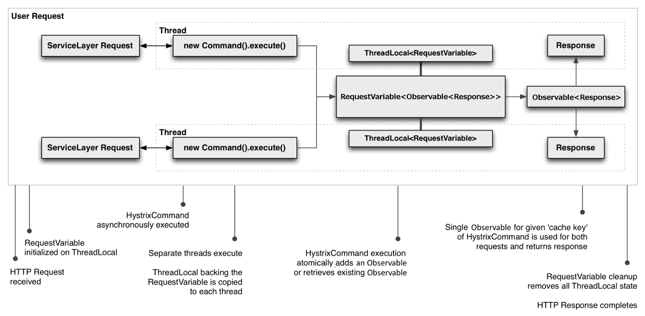 在HystrixCommand和HystrixObservableCommand的实现中,你可以定义一个缓存的 Key,这个 Key 用于在同一个请求上下文(全局或者用户级)中标识缓存的请求结果,当然,该缓存是线程安全的。