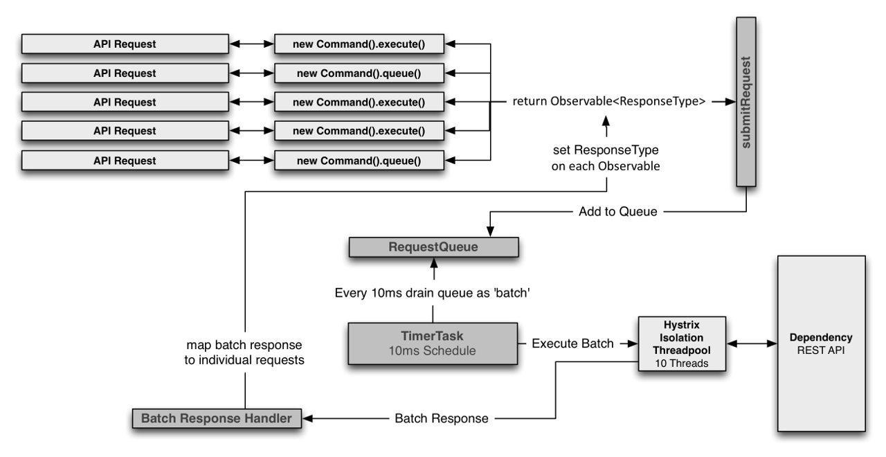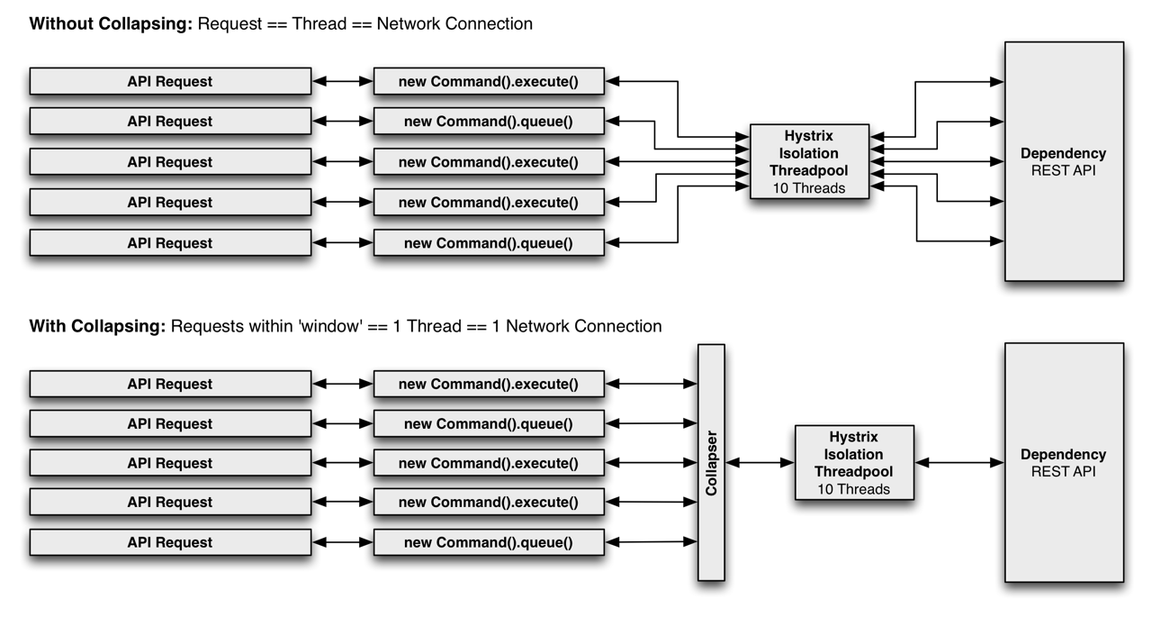 你可以在HystrixCommand之前放置一个『请求合并器』(HystrixCollapser为请求合并器的抽象父类),该合并器可以将多个发往同一个后端依赖服务的请求合并成一个。